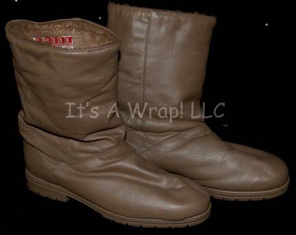 Description: A costume featured in various episodes of Star Trek: Deep Space Nine. This costume is that of a member of Bajoran security officer; a long-sleeved, tan uniform jacket featuring brown shoulders, Velcro patch for a commbadge (included but unattached), a zip down the front, an earring of the Bajoran-style, matching overall-style trousers with stirrups for the feet, tan, leather chunk-heel boots, phaser and tricorder holster. A sewn in tag on both reads ‘Deep Space Nine, Rudy Morrison’ and the costumer’s tag reads ‘Rudy Morrison, Joe Figueroa, Bajoran Security, DS9’.