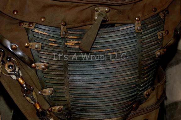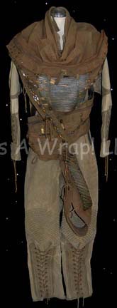 Description: A costume featured in the last TNG era feature film, Star Trek: Nemesis, and then reused in one of the last episodes of Star Trek: Enterprise, “Demons”. The costume consists of a long-sleeved, full-length jumpsuit in a distressed, aged, yellowed-brown color featuring diagonal quilting along the shoulders, Velcro and laced wrist cuff adjustment, a zip down the front, , a patch just under the right shoulder that reads “Orpheus Mining Colony, Est. 2090, Sine Qua Non”, reinforced quilting at the knees, zipped and laced ankle cuff adjustment. Also included is a piece of heavy-duty, leather body armor featuring metal and rubber accents on the front, various straps and snaps to secure it, netting to help the wearer stay cool, and olive-green canvas shoes. A sewn in tag reads ‘Enterprise, Jan Jones’.
