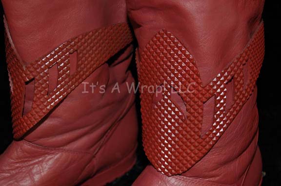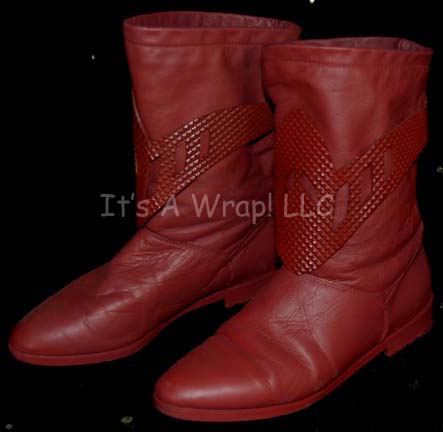 Description: A pair of leather boots painted rust colored with insulated interiors and matching vinyl Bajoran accents featured in various episodes of Star Trek: Deep Space Nine. The boots are ‘College Comfort’ name brand, made for female wearers, size 8, and come with a vinyl belt that matches the boot accents. The belt measures approx. 28.5 inches.
