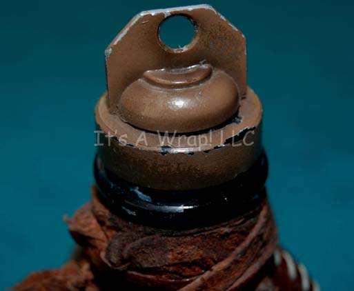 Description: A prop bottle featured in the Star Trek: Enterprise episode “United” for use by Jeffrey Combs in his portrayal of “Shran”. The item is a blue colored glass bottle covered with brown leather laced up the corners with leather strips off to the side and a cap. Inside the bottle is the dried remains of the special effects Andorian ‘blood’ meant to be the blood of murdered Imperial Guardsman “Talla” (Molly Brink). The item measures approx. 2.5 X 1.75 X 4.75 inches with a hexagonal shape.