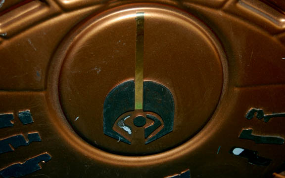 Description: A prop item similar to those featured in the Star Trek: Deep Space Nine episode ”Family Business”; wherein “Quark” (Armin Shimerman) finds that his assets are being seized because his mother has broken Ferengi law in making profits for herself. This item is a prop and does not actually open, is roughly circular, with a flat base added so it will sit upright, an oversized handle added, raised, black Ferengi script along the bottom and the symbol of the Ferengi Alliance prominently displayed in the middle; further black accents, and minor wear due to time and storage. This item measures approx. 13.5 X 5 X 17 inches.