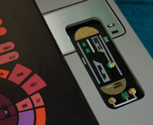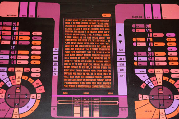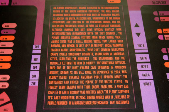 Description: A very large PADD believed to be featured episodes of Star Trek: Deep Space Nine. The item is made from fashioned resin with a large graphical application inset to the item, a series of metallic adhesives colored gold and silver accent the item. The graphic depicts two areas of multi-colored faux buttons and a centered description of Earth history including such information as the setting of ‘Mojave, California’, the location of Earth in ‘Sector 001’, humanity’s first contact with extra-terrestrial life officially in the ‘early 21st Century’ and prior to that with the Ferengi in ‘Roswell, New Mexico’ (taking place in the Star Trek: Deep Space Nine episode “Little Green Men”), and explaining the events of the ‘Bell Riots’ (in the episodes “Past Tense: Parts I and II”). The history goes on to detail the events of the ‘Third World War’ beginning in ‘2053’. The item measures approx. 24 X 16 X .25 inches.