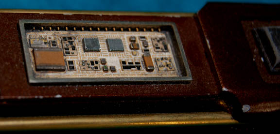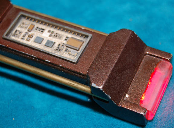 Description: A prop item featured in the Star Trek: Voyager episode “Body And Soul”; wherein “Seven of Nine” (Jeri Ryan) must download “The Doctor’s” (Robert Picardo) program into her neural implants to save him from a race of holo-phobic aliens who think are at war with the holograms they have created and refer to them as “holographic insurgents”. This item is a brown, resin cast tool with a slight weight to it, textured, vertical stripes along the handle, a black button that activates three working LEDs at the opposite end, gold-colored accents along the sides, faux “circuitry” in the middle, a clear plastic piece over the LEDs to protect them, and a black panel on the bottom of the handle that holds the battery. The item measures approx. 7 X 1 X 1 inches.