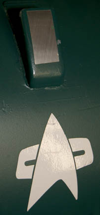 Description: A prop item similar to those featured variously throughout Star Trek: Deep Space Nine and Voyager. This item is a prop duffle bag that does not open; it is a cylinder-shaped, viridian colored, plastic container featuring graphical applications of the post 2370’s Starfleet sigil, an unknown silver symbol, various silver, black, and white accents, and a black shoulder strap. The item measures approx. 16.5 X 8.5 circular inches.