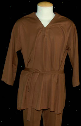 Description: A set of brown off duty wear featured in Star Trek I: The Motion Picture for wear by William Shatner in his portrayal of “Admiral Kirk”. The costume is a set of brown trousers and a matching top with a crimped appearing neckline and cuffs, with a waist tie. The trousers feature a sewn in Western Costume Co. tag reading ‘Mr. W. Shatner’.