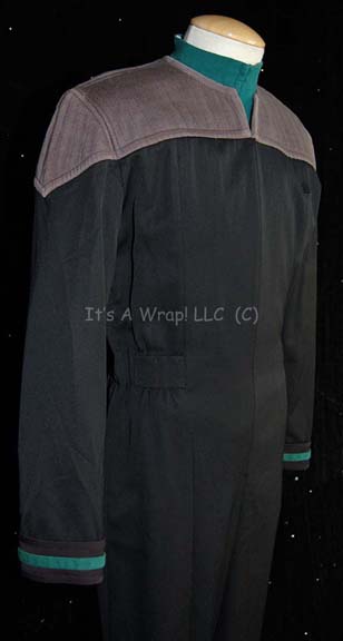 Description: A costume featured in the tenth Star Trek feature film” Nemesis”; wherein a political coup takes place in the Romulan Empire and the crew of the “Enterprise-E” travel into its heart and “Captain Picard” (Patrick Stewart) finds a familiar face planning the destruction of Earth. This costume is known as the “First Contact-style” Starfleet uniform because it was first used in the feature film of the same name and went on to become the standard; it consists of a long-sleeved, full-length, black jumpsuit featuring blue-gray, quilted shoulders, a Velcro patch for a commbadge (not included), hoops on the waist for tools, a long-sleeved undershirt in Sciences Blue with matching division colors around the cuffs of the jumpsuit. A sewn in tag in the jumpsuit reads ‘Andray Johnson, #31’ and the undershirt tag reads ‘Andray Johnson, 11-01’.