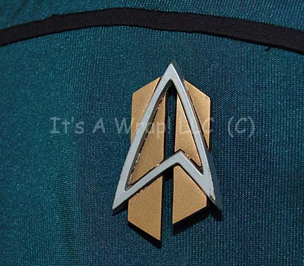 Description: A costume featured in the series finales of both Star treks: The Next Generation and Voyager. This costume is a future Starfleet uniform consisting of a long-sleeved, full-length, jumpsuit in Sciences Blue, a false, wrap-around style, a black horizontal piping across the front, black trousers with stirrups for the feet, Velcro patch for the future style commbadge (included but unattached), and a zip up the back. A costume tag reads ’51 Voyager, #748, Starfleet, Lou Simon’