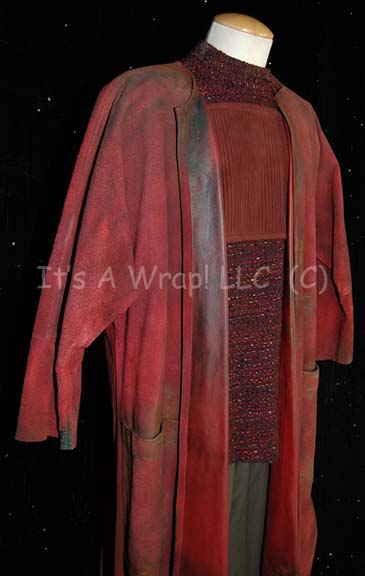 Description: A lot of costume items featured in various episode of Star Trek: The Next Generation and Deep Space Nine. This lot consists of gray trousers with overall straps sewn on that button along the waist, a distressed, dark-red, long-sleeved, full-length leather duster, a long-sleeved, boucle wool, maroon sweater with an inset of vertical pleats, soft, blue/gray trousers, a long-sleeved, purple tunic-style shirt with a textured, diamond-shaped pattern from the TNG episode “Chain of Command: Part I” and a pair of black, leather ankle boots with minor distress. A sewn in tag in the duster denotes reuse by Roy Brocksmith in a Deep Space Nine episode, the maroon sweater features a “Star Trek: TNG” tag but with an illegibly faded name, the blue/gray trousers’ sewn in tag reads ‘Deep Space Nine, Michael Dorn’, and the purple tunic tag reads ‘Star Trek: TNG, Michael Dorn’. Several costumers’ tags identify specific articles and one episode specific tag reads ‘#236 Chain of Command, Star Trek: next gen, Worf, Michael Dorn’.