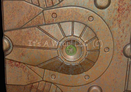 Description: A pair of vacuum formed wall panels with wood frames featured in multiple Star Trek: Enterprise episodes including “Impulse” and “The Council”. The items are wall panels that appeared in the Vulcan ship “Seleya” and in “Commander Dolim’s” (Scott McDonald) Xindi-Reptilian ship. The panels are vacuum formed plastic with wood frames painted to appear metallic gold, and bronze textured. They measure approx. 27.75 X 48 X 3.5 inches where they are raised for dimension.