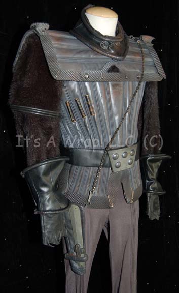 Description: A lot of Klingon costume items featured throughout Star Trek: Deep Space Nine. This lot consists of a gray, leather/vinyl pleated, jacket featuring textured, vertical stripes, a dark-gray, shoulder “armor” piece with diamond-shaped rubber detail, metal tabs, wood and metal accents on the chest; chain around the left shoulder attached to a metal bar, black faux fur sleeves with resin cast Klingon symbol on the left arm, and horizontal, black stripes above them. A long, sleeveless, gray undergarment with large vertical pleats, a second undergarment with a white stitched, swirl pattern, and one of the trademark Klingon belts featuring the trapezoidal buckle and five raised dots on it. A black leather gorget featuring black, rubber piping and Klingon iconographic symbols, matching gauntlets, gray, vinyl disruptor holster with resin cast accents, black suspenders, a pair of black, leather gloves with trimmed fingers and “claws” on the ends, a molded foam spinal piece, gray, pleated, overall-style trousers with stirrups for the feet, and black, vinyl spats. Multiple labels denote use by many actors.