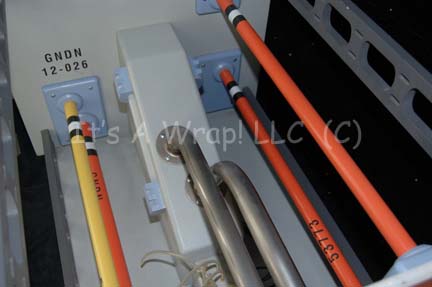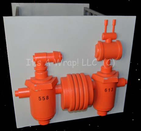 Description: A busy box like those featured in Star Trek: The Original Series, created for the Star Trek: Enterprise episode “In a Mirror, Darkly: Parts I and II”. The item is a large fashioned wood prop with PVC tubing, painted in the color scheme of The Original Series “Starship Enterprise”. The front of the item represents an access to conduit and ship’s systems that would technically be behind a bulkhead. The item also features a series of rubber tubing and connection leads to suggest hardware. It measures approx. 30 X 25 X 48 inches.