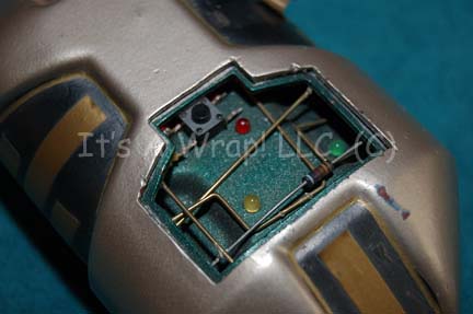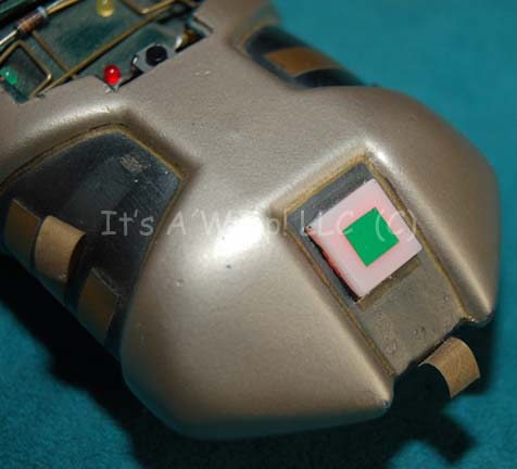 Description: A prop item featured in the Star Trek: Deep Space Nine episode “Shattered Mirror” for use by “Captain Bashir” (Alexander Siddig) as an agonizer he enjoyed using on “The Intendant” (Nana Visitor) upon her capture. The item is made from injection molded plastic painted metallic copper on the exterior with metallic gold adhesive details. The item features an inset cavity with lines of metal wire to suggest hardware and three lights colored yellow, red, and green which blink in sequence when the item is activated. The item works by pressing a small black button in the cavity or when a switch n the underside is repositioned at which point the item is on until the battery runs out. Activated, the item also illuminates a red light on the front end better seen in the episode that any of the other elements. The item is powered by an internally held ‘J’ sized battery (not included). The adhesive quality of the metallic gold detail lines is beginning to wear as they are peeling and rolling back on themselves in some places. The item measures approx. 4.5 X 2.5 X 1.5 inches.