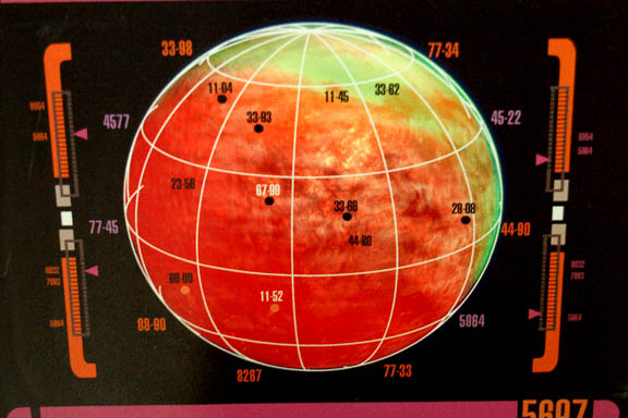 Description: A 24th Century style Starfleet Personal Access Display Device (PADD). It was presumably used on one of the 24th Century series and/or feature films including Star Trek: The Next Generation, Deep Space Nine or Voyager. The PADD is plastic painted silver with an LCARS style inset multicolored display screen that reads “Planetary Geology – 55364”. Attached to the PADD are numerous applications creating faux buttons and detail. The front of the PADD has become loose where the PADD bows slightly in the middle. Measures approx. 16 x 11 inches.