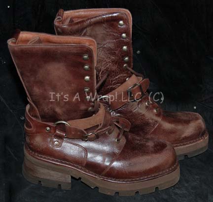 Description: A costume featured in Star Trek VIII: First Contact for wear by Brent Spiner in his portrayal of “Data”. The costume is a set of suede mustard colored trousers with black nylon suspenders and a matching belt, a mustard colored long sleeved button front shirt with a fine black zigzag pattern, a green colored zip front wool vest with brown leather shoulder accents, and a pair of brown leather ‘New Rock’ brand name boots with laces and straps. The vest and trousers feature sewn in Western Costume Co. tags reading ‘Brent Spiner’, the shirt was located with the lot, the boots feature interior labels reading ‘Data’, and a costumer’s tag reads ‘Data 21st Century’. The seams on the ribs on both sides of the shirt have minor tears or purposeful unstitching measuring 1-1.5 inches.