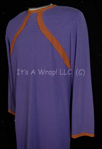 Description: A costume featured in the Star Trek: Deep Space Nine episode “The Abandoned”; wherein “Quark” (Armin Shimerman) finds an infant Jem'Hadar stasis pod with some salvage he had procured. This item is a long-sleeved, full-length, Bajoran sickbay gown, purple in color with a tan stripe along the shoulders, around the collar, and cuff, featuring a zip and ties down the back. A sewn in Deep Space Nine tag reads ‘Bumper Robinson'.