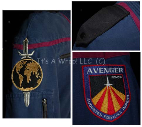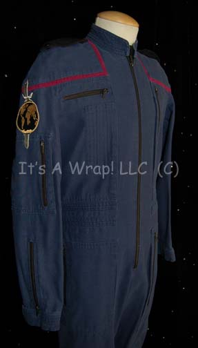 Description: A costume featured in the Star Trek: Enterprise “mirror universe” two episode story arc “In a Mirror, Darkly: Part I and II”; wherein The Federation has been replaced by a Terran Empire that rules by force and conquest instead of governing by diplomacy and democracy. This costume consists of a Terran Empire Starfleet uniform jumpsuit consisting of a full-length, long-sleeved, blue jumpsuit with seven functional, zipped pockets, an ‘Avenger NX-09’ left shoulder patch, a patch emblem of the Terran Empire on the right shoulder, Operations Red division strip around the shoulders, black epaulettes for rank, and a sleeveless, black undershirt that buttons down the front. A sewn in Enterprise tag on the undershirt reads ‘Danny Ogden #82’ and the jumpsuit Enterprise tag denotes use by several actors including Danny Ogden as well.
