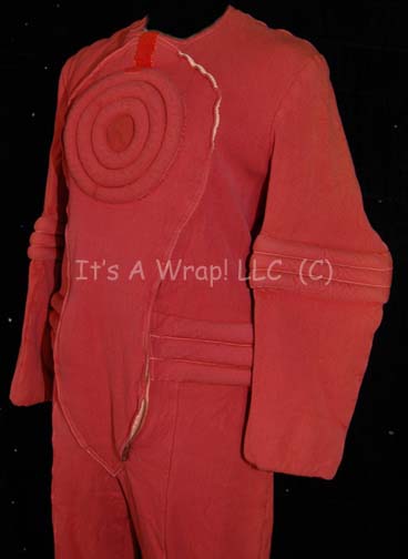 Description: An engineer’s radiological costume created for Star Trek feature films. The costume is a shrunk, red-orange suit believed to have been used in testing the effects of orange dye on its fabric due largely in part to the absence of accoutrements and that the sewn in Paramount tags are died along with the costume. A sewn in Paramount tag reads ‘Bill Couch Jr., a costumer’s tag reads ‘stock, engineer suits, shrunk, wrong color’.