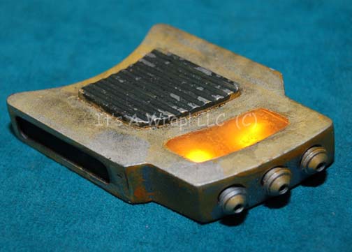 Description: A lot of props featured in the Star Trek: Enterprise episode “Borderland” for use by Orion Guards in the discipline of their prospective slave sales. One item, the ‘neurolytic restraint activator’ is made from molded resin with metal screw details, and a flashing yellow light. The item is powered by two internally mounted V392 sized batteries, activated by a depression button on the side. A departure from most Star Trek props, the lights will continue to flash at interval when activated whereas most others cease their electrical feature upon release of the button. This item is painted to have a metallic silver sheen that is dulled down by a paint scheme made to distress the item to the point that it appears used and to match the design of the Orion slavers. Also included are two static ‘nurolytic restrains’ with no electronic features made from cast resin These items are painted metallic silver with black painted details and metal wire side mounted ‘pins’ meant to appear as though they have punctured and grasped the skin of the wearer (the items appeared on the side of the neck of the characters in the episode). The item measures approx. 1.5 X 1.75 X .60 inches. The ‘activator’ measures approx. 3 X 2 X 0.5 inches.