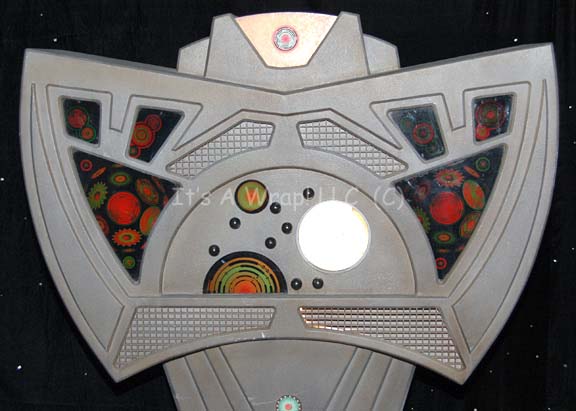 Description: A freestanding console featured in the Star Trek: Voyager episode “Flesh and Blood, Part I” as part of the captured Hirogen ship set. The item is distinctively of Cardassian origin and believed to have been part of “Deep Space Nine” sets prior to alteration for Voyager. The item is fashioned wood with multiple cut outs for acrylic interface panels that all feature a Hirogen theme. The item is painted gray and features an opaque light box on top, several black ball handled slide bars in the face of the item and is capable of lighting up internally to back light the acrylic elements. The interior lighting is activated by either or both plugs in the base into standard American Type-B three prong outlets which activates a series of internal fluorescent bulbs and standard light bulbs. One acrylic panel is missing from the face of the item, two adhesive graphical applications are present externally, the reverse cover panel unscrews to allow access to the interior. The item measures approx. 45 X 65 X 12.5 inches.
