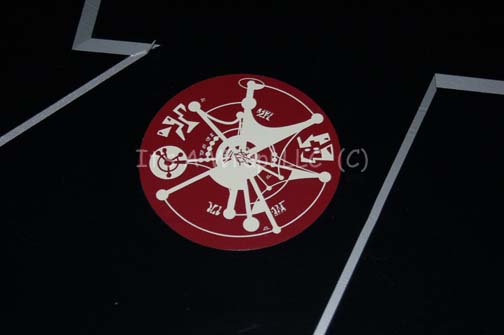 Description: A Cardassian shatter-style panel created for use in Star Trek: Deep Space Nine. The item is a black acrylic panel with beveled edges and gray adhesive detail lines meant to create the unique Cardassian production design. The item also features three differing circular Cardassian themed applications on the face and screw holes for mounting. A crack has formed from one of the insets to almost halfway through the item but it still retains its overall appeal. The item measures approx. 31 X 36 inches.