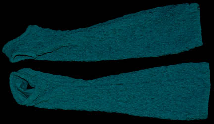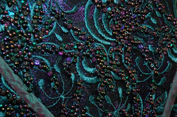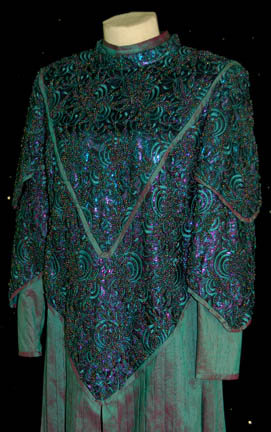 Description: A costume made for Whoopi Goldberg in her portrayal of “Guinan” in Star Trek VII: Generations. The costume is a green and purple iridescent dress with intricate beadwork and flower pattern, matching trousers, forearm sleeves, and shoes. The costumer’s tag reads ‘Guinen, made for Star Trek VII, Never used’, and the sewn in Star Trek VII tags read ‘Whoopi Goldberg’.
