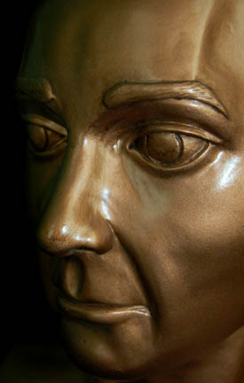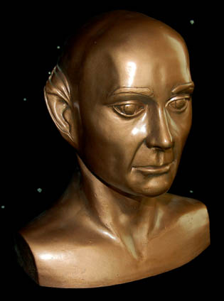 Description: A prop featured in scenes of "Kes's" (Jennifer Lien) quarters on Star Trek: Voyager. The item is a bust of a bald, male Ocompan cast in a copper colored resin. It measures approx. 8.5 X 12 X 16 inches.