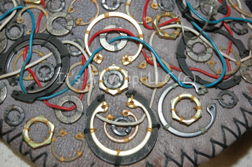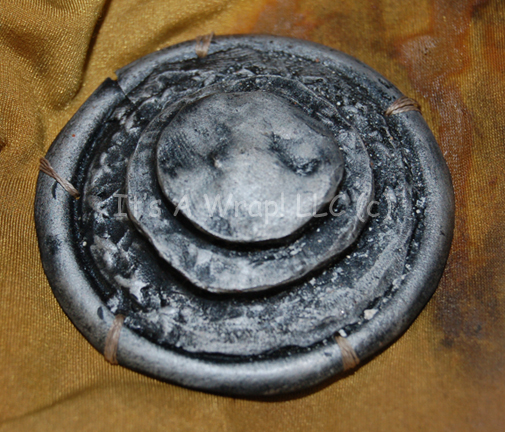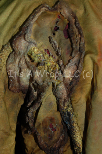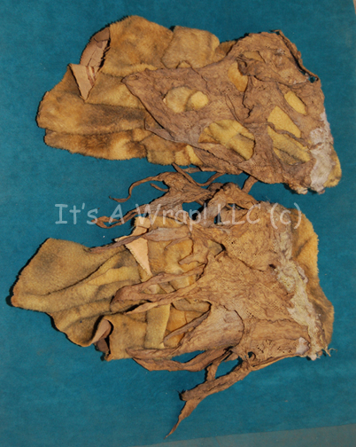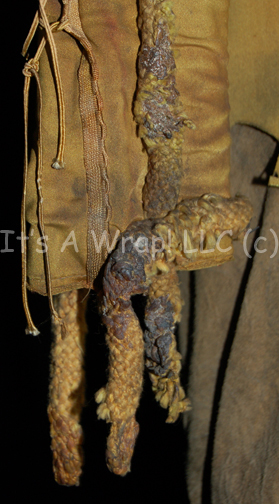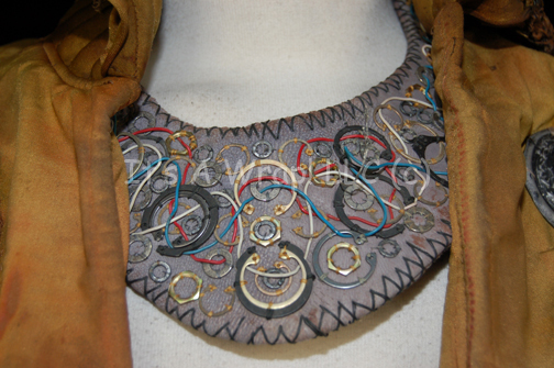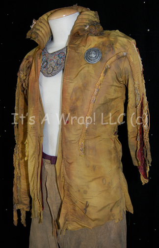 Description: A costume featured in the second Star Trek feature film “The Wrath of Kahn”. This costume a pair of dark purple spandex pants covered in purposefully distressed appearing tan leather covering, and an orange spandex jacket with affixed distressed tan synthetic material. The jacket features a significant degree of distress and accents in that the sleeves have broken laces running up the outer seam of the sleeves, nylon rope accents with melted burn marks, placed scorch holes in the back and front, and a wide ribbed collar. Interior tags indicate further use in Star Trek: Voyager and wear by various actors.