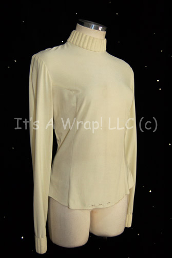 Description: A costume item featured in the third Star Trek feature film “The Search for Spock”. This item is a long-sleeved, Starfleet uniform undershirt in Command White, featuring collar ribbing, a zip up the back with clasps at the neck and a sewn in Paramount tag that reads ‘Robin Curtis 6’.