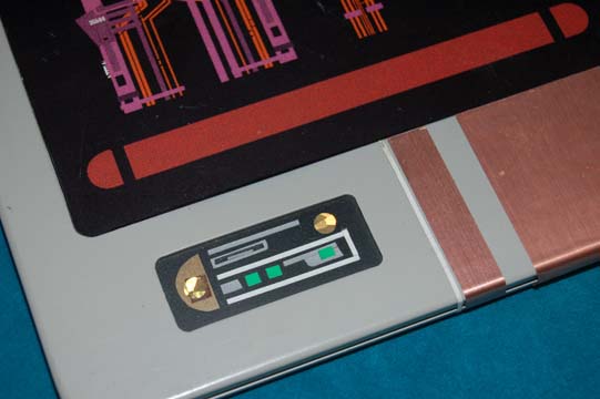 Description: A Starfleet style PADD (Personal Access Display Device) believed to have been featured in the Star Trek: Deep Space Nine episode “One Little Ship” for use by “O’Brien” (Colm Meaney) or “Dr. Bashir” (Alexander Siddig). The item is made possibly from acrylic with metallic copper adhesive details and multi-colored faux buttons. The front features an inset ‘display screen’ that is adorned with a graphical application depicting a circuitry diagram that is inscribed ‘Circuitry Bay 47’. The reverse depicts a degree of surface scratching which removed the paint in one small area (thus the possibility of acrylic), the front copper features one minor smudge. The item measures approx. 9 X 12 X 0.5 inches.