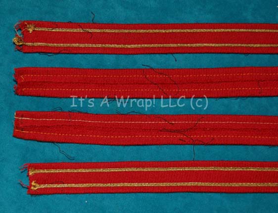 Description: A pair of fabric strips featured on the costume trousers of Starfleet uniforms in Star Trek feature films. The items are folded over and stitched sealed with gold colored fabric stripes, two side by side; meant to be sewn onto the outside seam of trousers to indicate the wearer to be part of the admiralty. The items are 48 inches long and retain threads from removal.