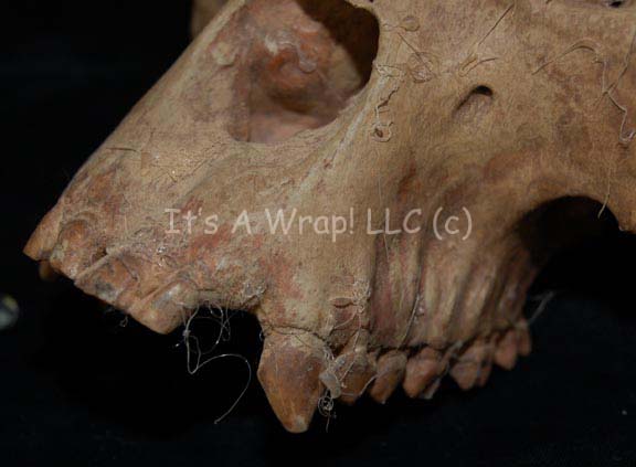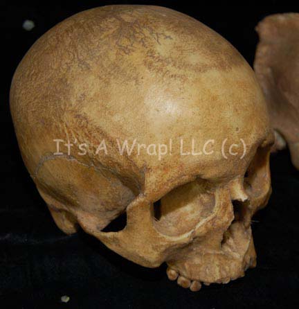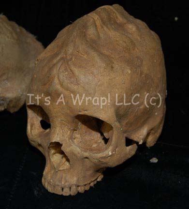 Description: A lot of four prop skulls acquired for Star Trek episodic television. The items are molded resin with hollow ‘brain cases’, and very realistic. Two of the item feature special affect make-up created to generate the appearance of head ridges. One skull is clearly meant to be a Klingon skull. The make-up appliances are painted to match the skulls and are seamlessly applied. The items are distressed to appear aged and ‘dirty’, and some feature ‘cobwebs’. The largest skull measures approx. 11 X 7 X 5 inches.