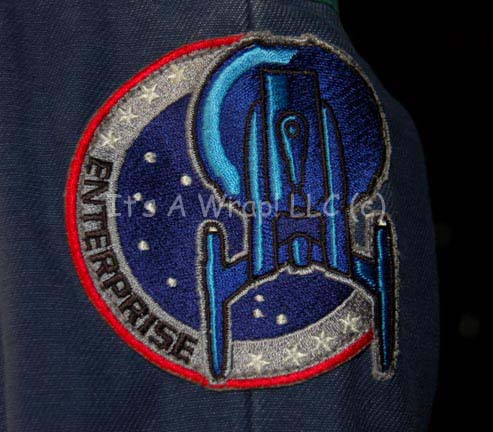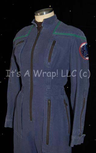 Description: A Starfleet uniform jumpsuit including the famous ‘Enterprise NX-01’ left shoulder patch with Sciences Blue division trim around the shoulders. “Enterprise” costumes feature multiple zippered pockets, Velcro size adjustments and zippers at the wrists and ankles, come with detachable shoulder pads, and a black, long-sleeved, button up undershirt. A sewn in Enterprise tag in both garments read ‘Lalita Lauren’ and a costumer’s tag reads ‘Lalita Lauren, 6, Blue, 112’.