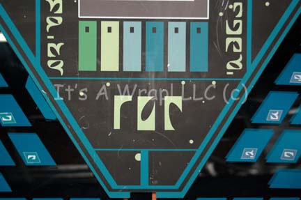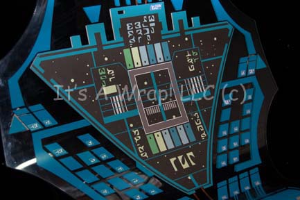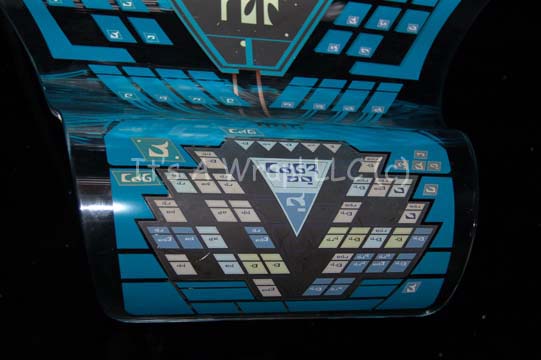 Description: A prop computer console featured in multiple episodes of Star Trek: Enterprise beginning with the pilot episode “Broken Bow” where it was a Suliban console, then later in the episodes “Babel One”, “United”, and “The Aenar” where it was altered to appear as Romulan computer consoles. The item is a freestanding formed clear acrylic panel on a wood base with metal braces and screw holes for mounting onto a larger base. The item features multiple faux rubber gel buttons, a large Romulan style ‘display screen' graphic on both the front and reverse, with teal application details and Romulan iconography accents across the whole front. A lighting feature is present on the reverse which is connected to leads present on the underside of the main computer interface. The lighting bulb placements are accompanying though unattached with one having a bank of strobing blue and green lights, the other with two functioning lights, both powered by 9volt batteries (not included) on remaining wires or exposed adhered copper strips. The item measures approx. 60 X 29 X 25 inches.