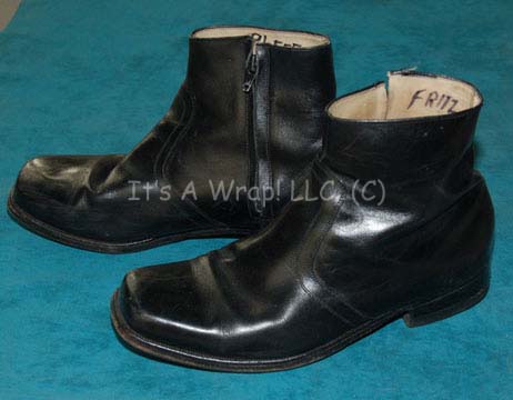 Description: A costume featured in the Star Trek: Deep Space Nine episode “Inter Arma Enim Silent Leges”; wherein “Dr. Bashir” (Alexander Siddig) attends a medical conference on Romulus and gets involved with a plot by Section 31 to keep the Romulans as allies against the Dominion. This costume consists of a sleeveless, gun-metal gray vest featuring a textured, floral print, a long-sleeved, dark-gray, pinstriped, suit jacket with clasps down the front, a matching dickie sewn onto a short-sleeved, white, t-shirt, corresponding, overall-style trousers with stirrups for the feet, and black, leather ankle boots. Sewn in tags denote wear by different actors but one reads ‘Deep Space Nine, William Sadler’, and the costumer’s tag reads ‘DS9 #565, Sloan, William Sadler’.