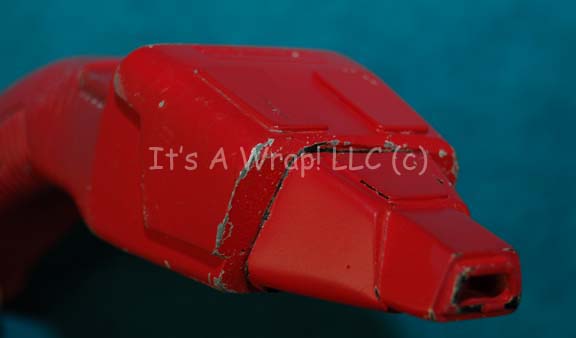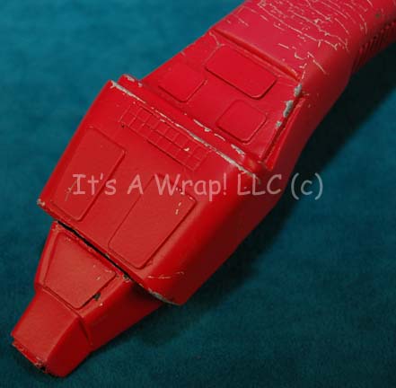 Description: A prop Starfleet Type II phaser featured in Star Trek IX: Insurrection for use by Starfleet personnel in red cloaking suits during the beginning of the movie. The item is made from sturdy molded rubber with multiple raised features, a firing button that depresses slightly, and an adhered emitter end. The emitter end depicts a degree of repair (re-adhered) and the item is painted entirely red. A series of visible cracks which are not unusual to molded rubber hand props run along the curvature of the hand grip, and around many of the raised edges. The item is unique in its coloration and retains its value for its specific use. The item measures approx. 8 X 2 X 2 inches. The item is rigid, bends slightly when attempted, and gives minimally when pressed.
