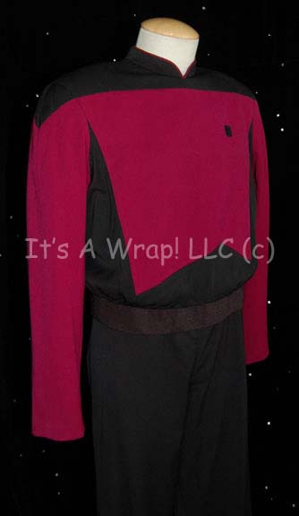 Description: A costume featured in various episodes of Star Trek: The Next Generation and then early episodes of Star Trek: Deep Space Nine. This costume is the two-piece variant of the TNG-style uniform jumpsuit consisting of a long-sleeved black jacket featuring Command Red division colors across the chest, back, sleeves and along the top of the Mandarin collar; a Velcro patch for a commbadge (sold separately), a zip up the back, and black uniform trousers. A sewn in Deep Space Nine tag in the jacket reads ‘Steve Nunnally’ and a similar tag in the trousers reads ‘Brennan Dyson’.