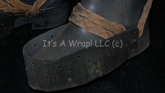 Description: A pair of Klingon themed costume boots appearing in various episodes of Star Trek: Enterprise. The items are tall ‘Vibram’ name brand boots with woven leather adornments and vinyl accents stapled around the front and sides of the foot, made to emulate metal reinforcements. The boots are labeled internally ‘Chad Haywood’ and are believed to be size 10.