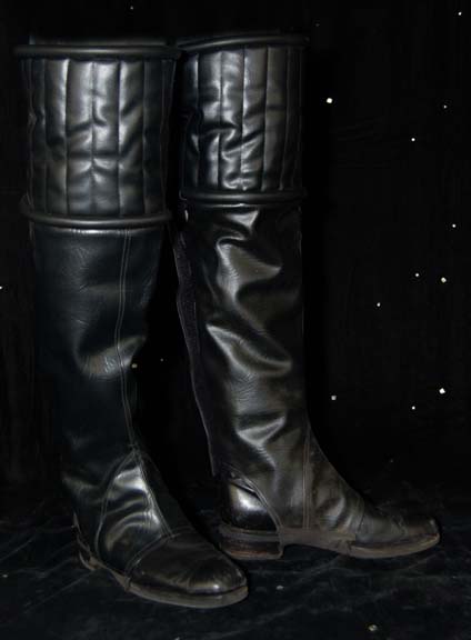 Description: Make any boots ‘Klingon' costume boots with these Klingon spats. Presumably made for Star Trek: Enterprise, these black vinyl spats fit easily over and around footwear, fixed in place by black elastic stirrups, then over the shin and around the calf where they Velcro up the back of the leg. Measures approx 28.5 inches long when lying on a flat surface.