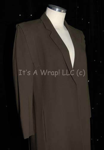 Description: A costume item similar to those featured throughout Star Trek: Voyager. This item is a long-sleeved, dark olive-colored jacket worn on away missions in various episodes. A sewn in Voyager tag reads ‘Kate Mulgrew’ and is one of only a few such items thus located.