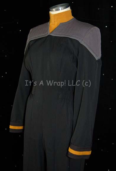 Description: A Starfleet uniform in the style that made its first appearance in Star Trek VIII: First Contact comprised of a full-length black jumpsuit with gray quilted shoulders. The jumpsuit features black elastic stirrups at the feet, a form fitting elastic waistband sewn inside with attached loops for ‘away team’ gear, a Velcro patch on the left breast for a commbadge (sold separately), and a Operations Gold division stripe at the cuff. The uniform zips up the front and comes complete with a separate long sleeved undershirt matching the division cuff color that zips up the front. Uniforms like this were also seen in Star Trek: Deep Space Nine after the episode “Rapture”, in late seasons of Star Trek: Voyager, and Star Trek IX: Insurrection but this one was featured in Star Trek X: Nemesis. A sewn in tag in the jumpsuit reads ‘Jenny Delker, 11-01, Nemesis’, the undershirt features a sewn in Muto Little, Los Angeles tag, a second tag that reads ‘Bovana Brumley, 10-01, 6’, and a costumer’s tag that reads’ Jenny Delker, 6, gold, 068’.