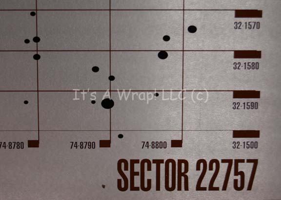 Description: A specially designed acrylic panel created for Star Trek episodic television or feature films. The item is a translucent sheet of smoked acrylic with silk-screened multi-colored graphics applied across the face. The item features rounded corners, one of which is broken off next to a substantial crack in the acrylic the pieces of which fit back together flush. The LCARS style graphic (Library Computer Access and Retrieval System) depicts a grid of stellar mapping with a red border stair-stepping around several of the sections. Stars are depicted in all of the grid sections and numeric values denoting their location or cataloging. A series of numeric values exist across the top of the information bar and a listing detailing the map as ‘Stellar Cartography – Map 2387’, one across the bottom reads ‘Sector 22757’. The item measures approx. 36 X 21 inches. Unlike many acrylic panels of this sort, the graphics on the face of the item are visible all the time, but reverse back lighting the item only brings them out more. The item was photographed with diffusion during illumination.