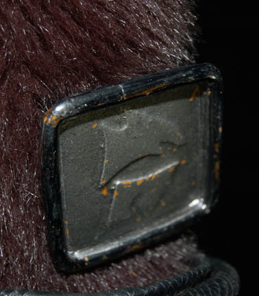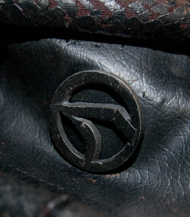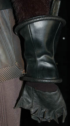 Description: A costume similar to those featured Star Trek: Voyager and Deep Space Nine. Almost every garment of this costume has a label in it that reads “Grace Harrell” and is the last 24th century female Klingon costume thus far located; it is mauve-colored, overall-style leggings with stirrups for the feet, black leather gauntlets, a gorget with Klingon sigil pins on either side of the next, black leather, fingerless gloves with “claws” inserted, a gray leather D’k tahg scabbard with knife, a black leather belt featuring a metal trapezoidal buckle with five raised dots on it and a black, leather snap case. A gray, leather/vinyl jacket featuring black, faux fur along the sleeves, a heavily engraved and decorated, fiberglass breastplate, textured plastic accents down from the shoulders and across the chest, horizontal stripes above them, more faux fur and metal studs just above the breastplate; similar stripes and plastic accents under the breastplate, a foam spine on the back, random clasp chain, Klingon sigil on the left arm, knee-length, red-brown rubber boots with vertical, textured, stripes along the top and spikes on the toes. Almost every aspect of the costume is somehow labeled with the name “Grace Hurrell”.
