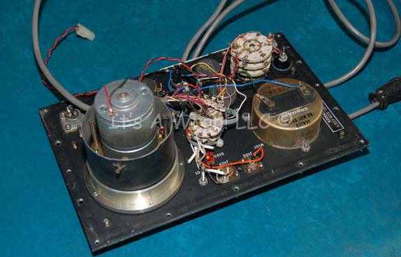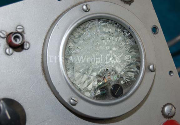 Description: A set piece featured in multiple episodes of Star Trek: Voyager as part of the instrument gauges on the “Delta Flyer” next to the pilot seat. The item, having seen better condition, is a gauge panel with multiple screw holes for mounting, painted metallic silver with red and black dials, a rubber covered switch and two gauges with shattered or missing glass. The hardwired workings on the reverse sport no indication of functionality, two wires and cables are connected to the back. The item measures approx. 11.25 X 7.25 X 4.25 inches.