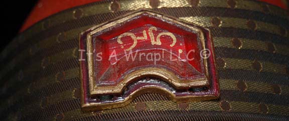 Description: A costume element similar to those featured in various Star Trek feature films. This item is a rust-colored, felt, hat in the Vulcan-style featuring metallic brown and gold-colored stripes around the lip of the hat forming a chinstrap and second strap that comes to a point on the chest; a rounded, quilted accent along the back of the hat in the same striped pattern, a red ‘jewel’ on the front with Vulcan iconographic symbols, and a Paramount tag that reads ‘Large #8’.