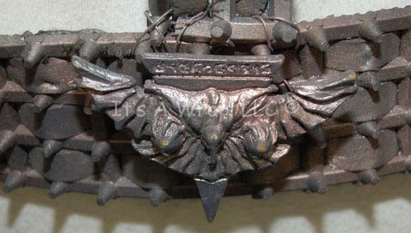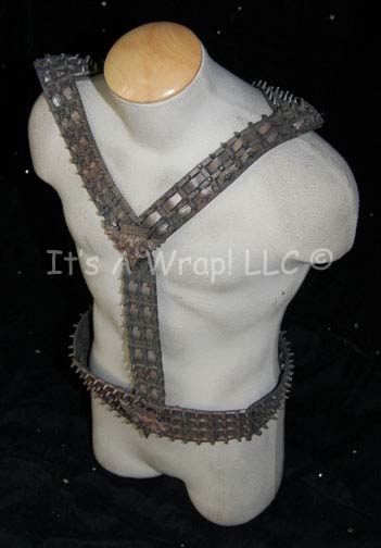 Description: A costume accessory created for use with Romulan fleet uniforms appearing in episodes of Star Trek: The Next Generation, Deep Space Nine, and Voyager. The item is a combination of neoprene with strips of fashioned Dri-Deck name brand vinyl held together using wiring and Velcro. Four Romulan Star Empire emblem badges are wired into the joins of the item made from molded resin. The entire item is adorned with a slight glaze of metallic copper and silver paint. Interior adhesive labels indicate front and back, one label reads ‘Zurrick’. Combine one with your already existing Romulan costume!