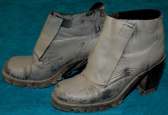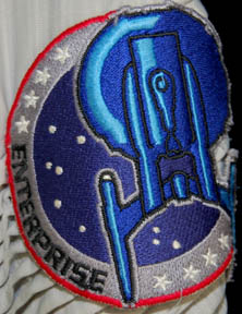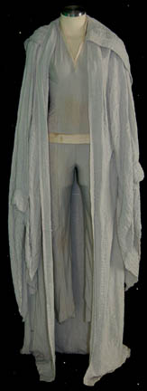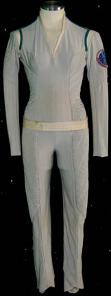 Description: A costume featured throughout the “Kir’Shara” story arc in the fourth season of Star Trek: Enterprise. This costume is for wear by Jolene Blalock as “T’Pol” and her stunt double Boniee Yanagisawa; an off white, form fitting, long-sleeved, full-length jumpsuit and featuring diagonal pleating down the abdomen and sleeves, a cream and a teal colored stripe on the shoulder (possibly a division strip), a sewn on ‘Enterprise NX-01’ assignment patch on the left shoulder and two matching belts. The costume is distressed to appear ‘dirty’ from extended wear in desert conditions and features ‘Vulcan bloodstains’ down the right leg below the knee corresponding to a series of puncture holes. Both belts are labeled for use by Jolene Blalock but one also features the name of the aforementioned stunt woman and the jumpsuit has a sewn in Enterprise tag with both names in faded ink with episodes numbers that have faded to illegibility. A costumer’s tag reads ‘T’Pol, Jolene Blalock, Desert Robes, Season 3 and 4’.