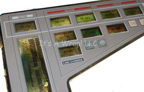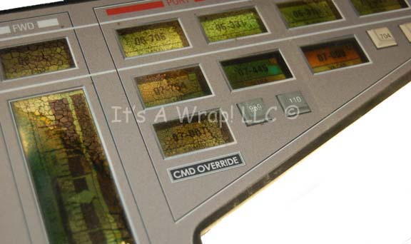 Description: An irregularly shaped button panel featured in various Star Trek: Enterprise episodes like “Shockwave, Part I”. The item is apiece of smoked acrylic with a translucent graphical application applied to the reverse that is best viewed when backlit by an external light source, and a graphical application adhered to the face used to frame the opposing indicator lights and gages. The translucent graphic suffered some visible damage due likely to heat during storage that appears as a crackle pattern when back lit. The face of the item is in no way disturbed. Measures approx. 14 X 8 inches.