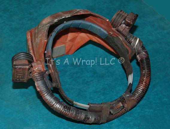 Description: A prop mining mask featured in Star Trek VI: The Undiscovered Country for use by alien prisoners in the dilithium mines of Rura Penthe. The item is sturdy molded plastic painted rust red with multiple points of distress to appear ‘abused’, some spotting of metallic silver paint to appear metal. The item features a pivoting fortification, a see through eye piece, a head ring that is size adjusting, and a pair of currently non-functional lamps on at the temples. It is believed the lights could be made to function again providing a change of bulbs. The item measures approx. 9 X 13 X 12 inches. A single crack is present in the top of the mask with is not believed to be part of the overall appearance of the item.