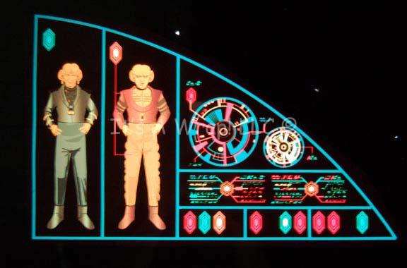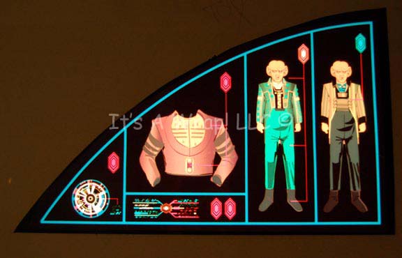 Description: A pair of computer console readouts created in the style of Ferengi characters believed to have been developed for episodes of Star Trek: Deep Space Nine, or a non-production exhibition. The items are a pair of smoked acrylic panels with multi-colored graphical applications adhered to the reverse best viewed when back lit by an external light source. The items depict Ferengi costumes like those worn by “Quark” (Armin Shimerman) and “Rom” (Max Grodenchik), in face the figures depicted in the items appear strikingly similar to the characters. The item is adorned with Ferengi themed console graphics and iconography. One item has yet to have its protective sheet removed from the face, the other is ready for display use. The items measure approx. 37 X 27.25 inches with screw holes for wall mounting.