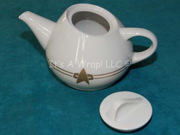 Description: A white ceramic teapot believed to have been acquired for the wedding scene in Star Trek X: Nemesis. The item is adorned with metallic gold colored Starfleet emblems on both sides and detail lines that run around it. The lid is removable and the item appears in every way practical for use. The base is inscribed ‘Inter American Porcelain, Made in Poland’. Item measures approx.4.75 X 8 X 5.25 inches diameter.